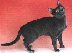 The Korat coat has a special attribute of not floating off when the cat is held and petted; mixing breeding would deprive the coat of this quality as well as its sleek, silky closeness. Each hair is lighter at the roots and tipped with a characteristic highly prized silvering that casts a halo over the body. The body is firm and muscular, all smooth curves, with a feeling of hard-coiled spring power. The cat is semi-cobby and medium sized. The back is carried in a curve. The distance along the back from the nape of the neck to the tail appears to be equal to the distance from the base of the tail to the floor. The tail is thick at the base, tapering to a rounded tip, not whippy.